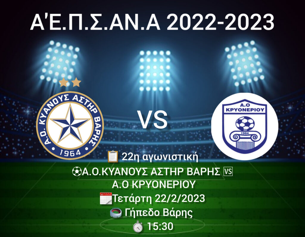 Την Τετάρτη 22/2 ο ΑΣΤΕΡΑΣ μας θα αντιμετωπίσει τον Α.Ο ΚΡΥΟΝΕΡΙΟΥ εντός έδρας για την εμβόλιμη 22η αγωνιστική του πρωταθλήματος Α’Ε.Π.Σ.ΑΝ.Α.