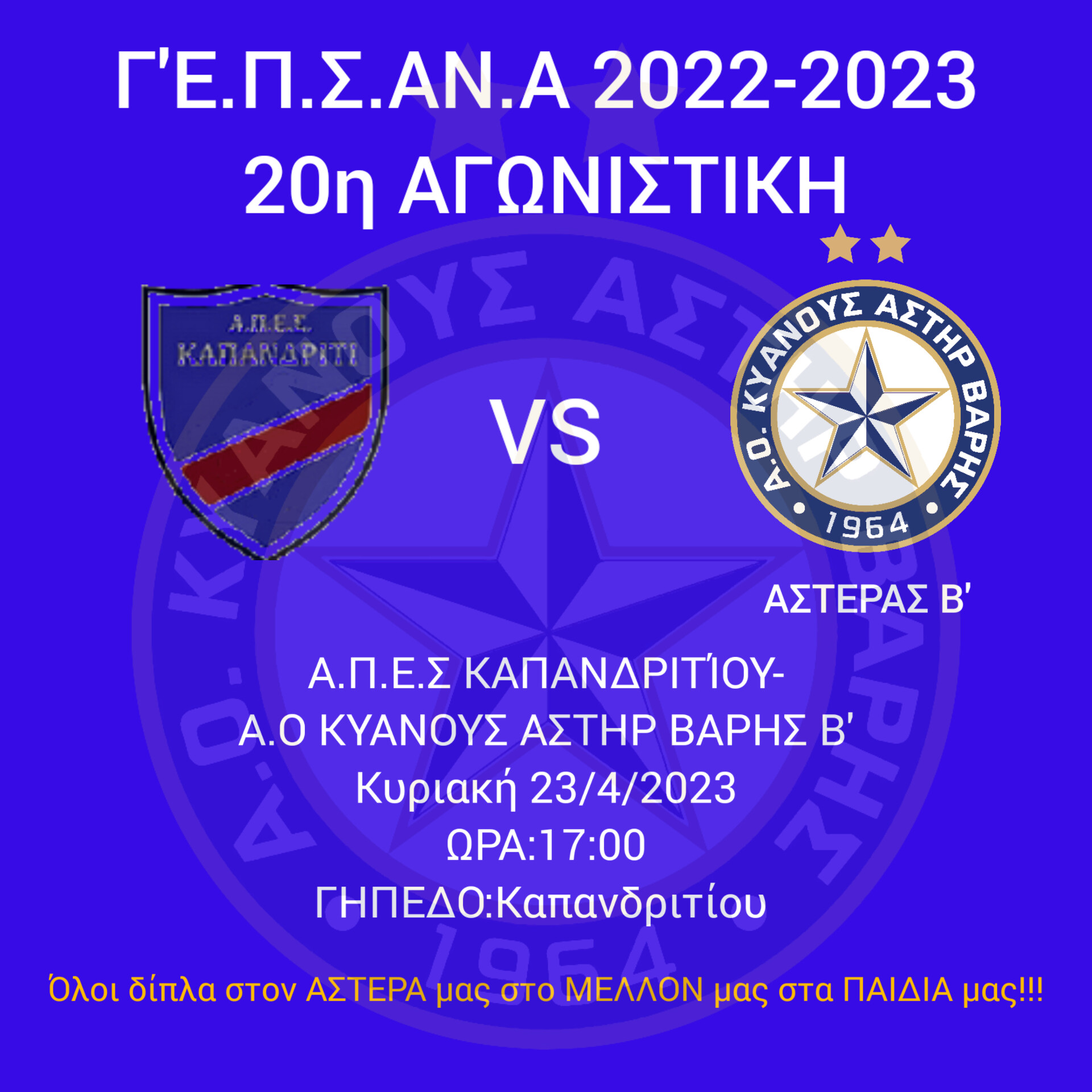 Την Κυριακή 23/4 αντιμετωπίζουμε εκτός έδρας τον Α.Π.Ε.Σ Καπανδριτίου για την 20η Αγωνιστική του Πρωταθλήματος Γ’Ε.Π.Σ.ΑΝ.Α.