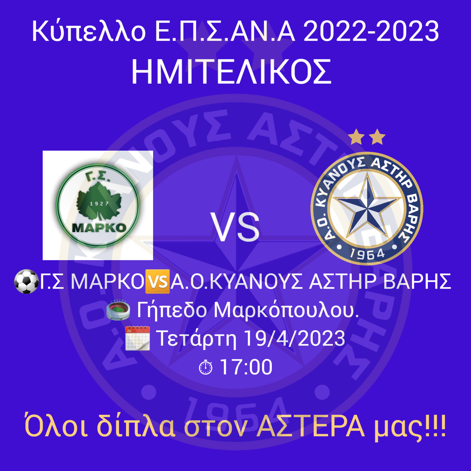 Την Τετάρτη 19/4 ο ΑΣΤΕΡΑΣ μας θα αντιμετωπίσει τον Γ.Σ ΜΑΡΚΟ εκτός έδρας για το δεύτερο παιχνίδι της ημιτελικής φάσης του κυπέλλου Ε.Π.Σ.ΑΝ.Α.