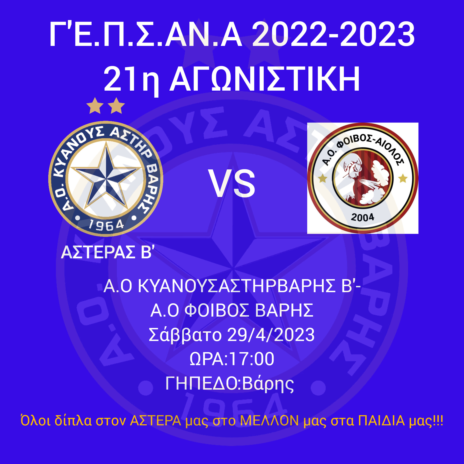 To Σάββατο 29/4 αντιμετωπίζουμε εντός έδρας τον Α.Ο Φοίβος Βάρης για την 21η Αγωνιστική του Πρωταθλήματος Γ’Ε.Π.Σ.ΑΝ.Α.