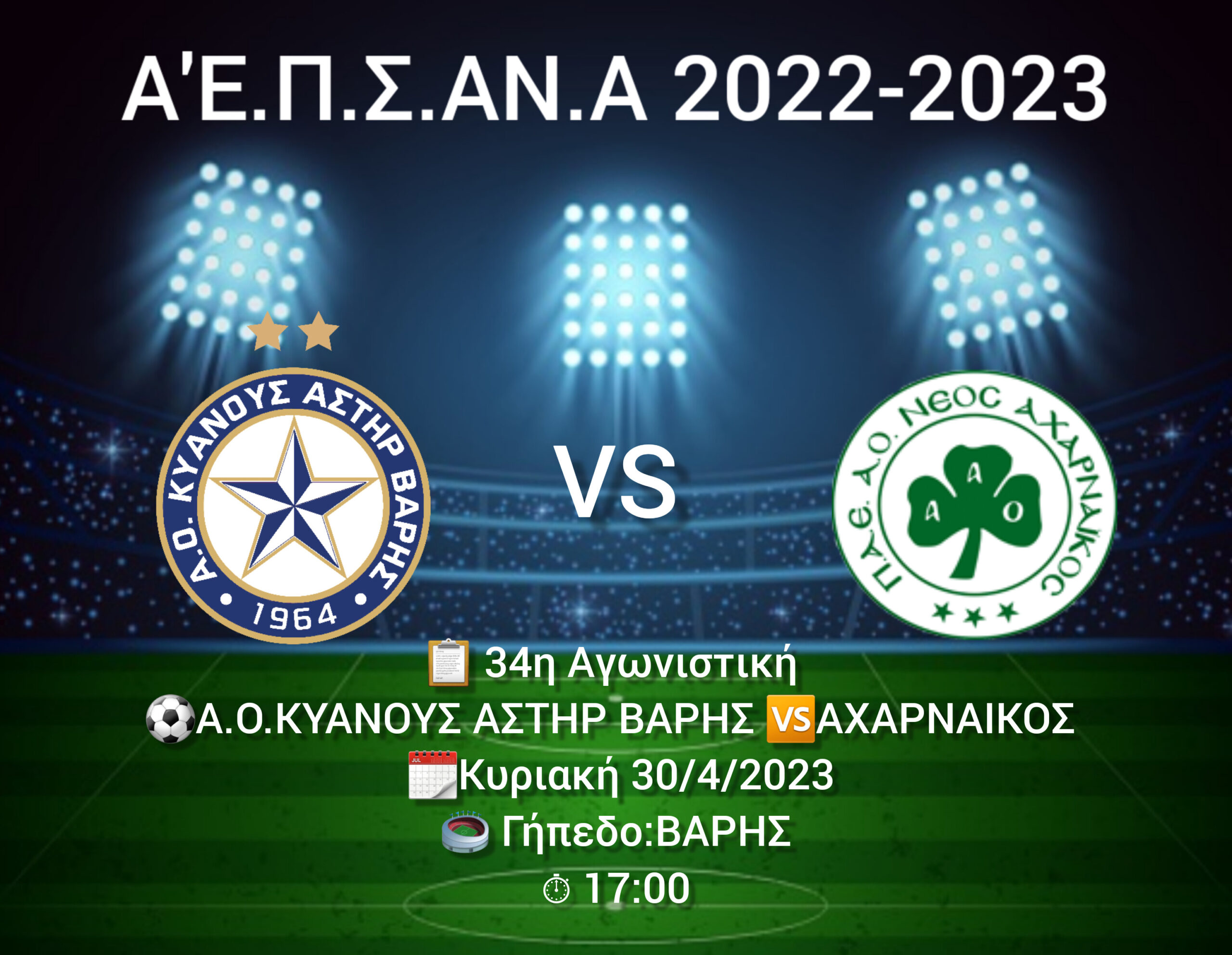 Την Κυριακή 30/4 ο ΑΣΤΕΡΑΣ μας θα αντιμετωπίσει τον ΑΧΑΡΝΑΙΚΟ εντός έδρας για την 34η Τελευταία αγωνιστική του πρωταθλήματος Α’Ε.Π.Σ.ΑΝ.Α.