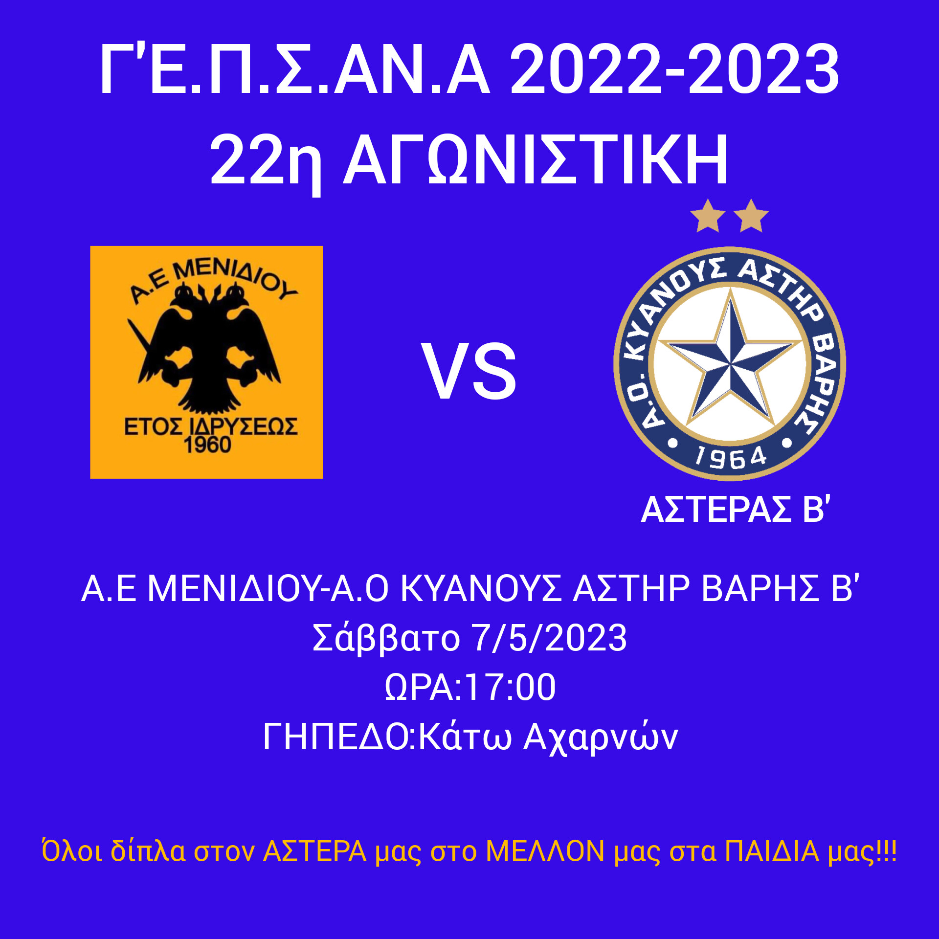 Tην Κυριακή 7/5 αντιμετωπίζουμε εκτός έδρας την Α.Ε ΜΕΝΙΔΙΟΥ για την τελευταία 22η Αγωνιστική του Πρωταθλήματος Γ’Ε.Π.Σ.ΑΝ.Α.