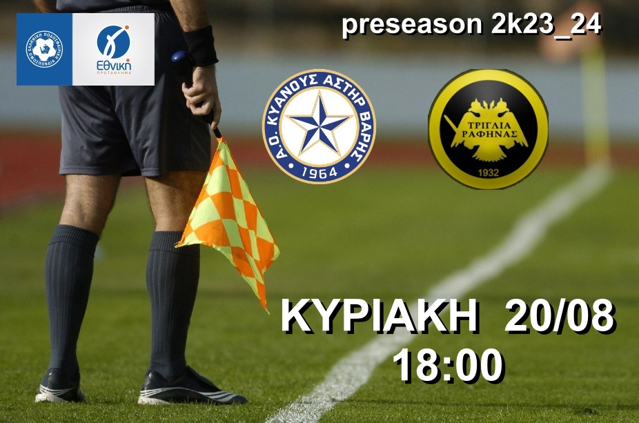 Φιλικός Αγώνας Προετοιμασίας Για Την Αντρική Μας!!! από asterasvaris | Αυγ 20, 2023 | Γενικά | 0 Σχόλια ιλικός αγώνας προετοιμασίας ΑΟ ΚΥΑΝΟΥΣ ΑΣΤΗΡ ΒΑΡΗΣ – ΑΟ ΤΡΙΓΛΙΑ ΡΑΦΗΝΑΣ την ΚΥΡΙΑΚΗ 20/08/2023 με ώρα έναρξης 18:00