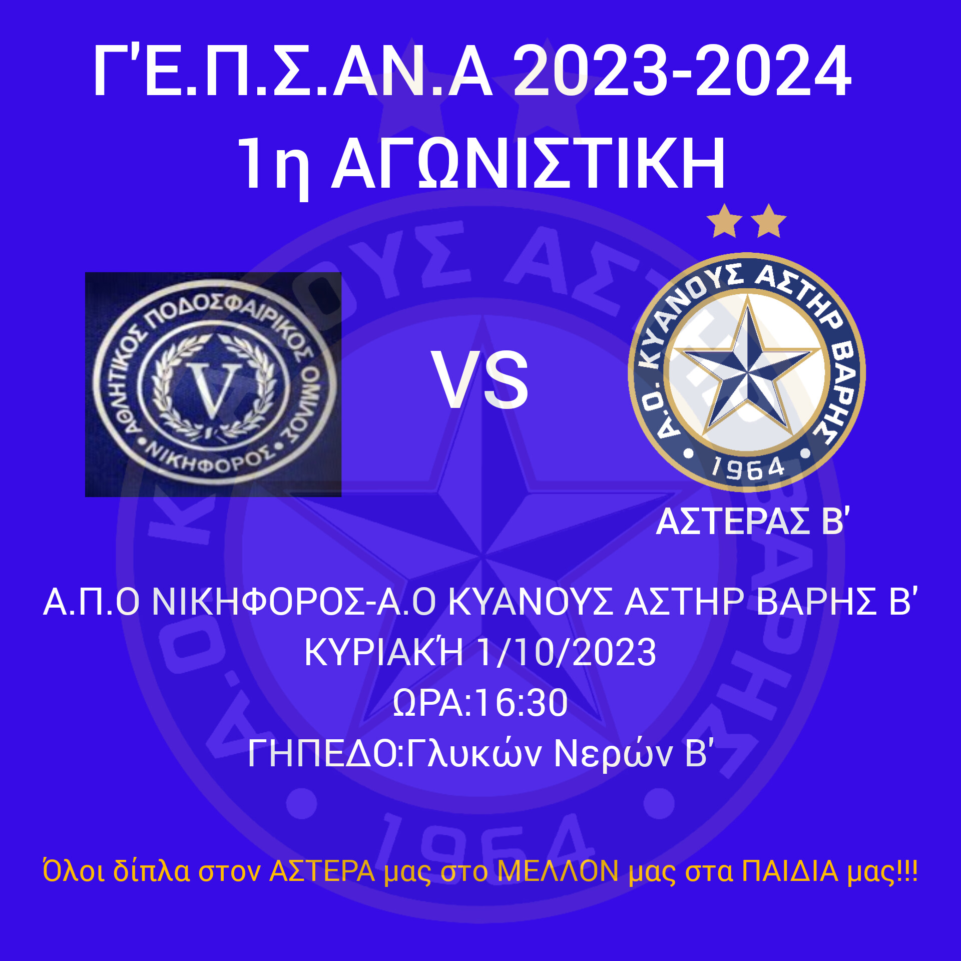 1η Αγωνιστική Πρωταθλήματος Γ’Ε.Π.Σ.ΑΝ.Α 2023-2024 από asterasvaris | Σεπ 26, 2023 | Γενικά | 0 Σχόλια Ο ΑΟ ΚΥΑΝΟΥΣ ΑΣΤΗΡ ΒΑΡΗΣ Β΄ ΑΓΩΝΙΖΕΤΑΙ ΣΤΟ ΓΗΠΕΔΟ ΤΩΝ ΓΛΥΚΩΝ ΝΕΡΩΝ ΤΗΝ ΚΥΡΙΑΚΗ 01/10 ΣΤΙΣ 16:30 ΜΕ ΑΝΤΙΠΑΛΟ ΤΗΝ ΟΜΑΔΑ ΤΟΥ ΑΠΟ ΝΙΚΗΦΟΡΟΥ. Όλοι δίπλα στον ΑΣΤΕΡΑ μας στο ΜΕΛΛΟΝ μας στα ΠΑΙΔΙΑ μας!!!