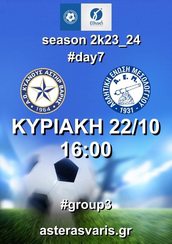 Την Κυριακή 22/10/2023 στο πλαίσιο της 7ης αγωνιστικής για το πρωτάθλημα της Γ΄ Εθνικής για την αγωνιστική περίοδος 2023-2024 υποδεχόμαστε στο Δημοτικό Αθλητικό Κέντρο Βάρης το Μεσολόγγι με ώρα έναρξης 16:00.