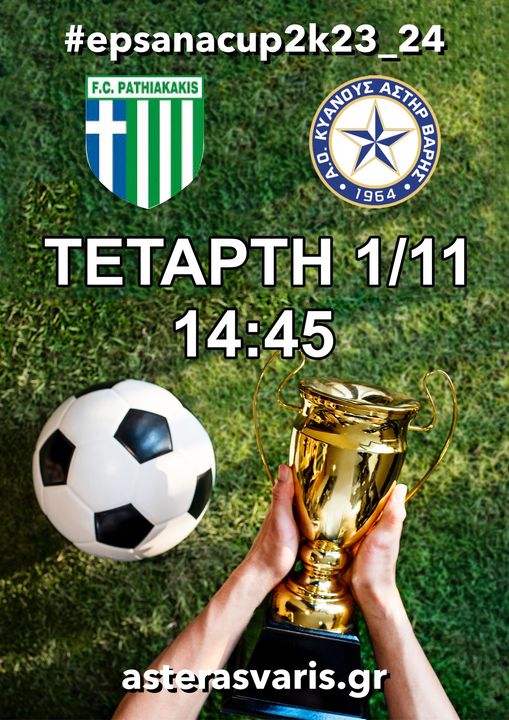 Tην ΤΕΤΑΡΤΗ 01/11/2023 η ομάδα μας αντιμετωπίζει για την 2η φάση του Κυπέλλου της Ε.Π.Σ.ΑΝ.Α, στο γήπεδο της ΑΝΟΙΞΗΣ Γ. ΚΥΡΙΑΚΗΣ τον ΠΑΘΙΑΚΑΚΗ με ώρα έναρξης 14:45.