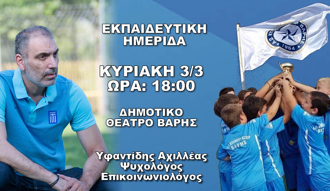 Το απόγευμα της Κυριακής 3 Μαρτίου τα τμήματα υποδομής του ΑΟ Κυανού Αστήρ Βάρης διοργανώνουν εκπαιδευτική ημερίδα, με ομιλητή τον Αχιλλέα Υφαντίδη.