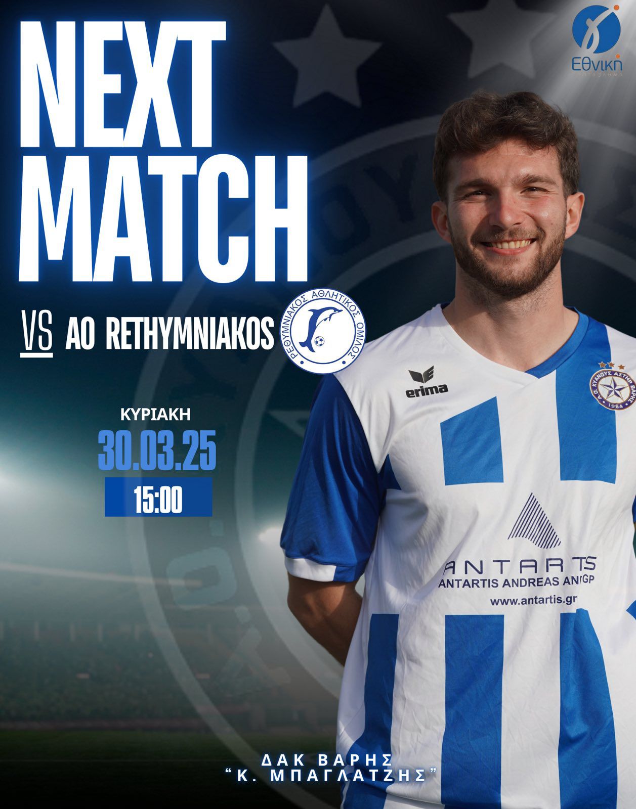 Το διοικητικό συμβούλιο του συλλόγου, το τεχνικό επιτελείο και οι ποδοσφαιριστές απευθύνουν κάλεσμα στους φιλάθλους να παρακολουθήσουν τον αγώνα της Γ’ Εθνικής για την 30η αγωνιστική του πρωταθλήματος: ΑΟ ΚΥΑΝΟΥΣ ΑΣΤΗΡ ΒΑΡΗΣ-ΡΕΘΥΜΝΙΑΚΟΣ ΑΟ στο ΔΑΚ Βάρης «Κωνσταντίνος Μπαγλατζης» και ώρα 16.00 .