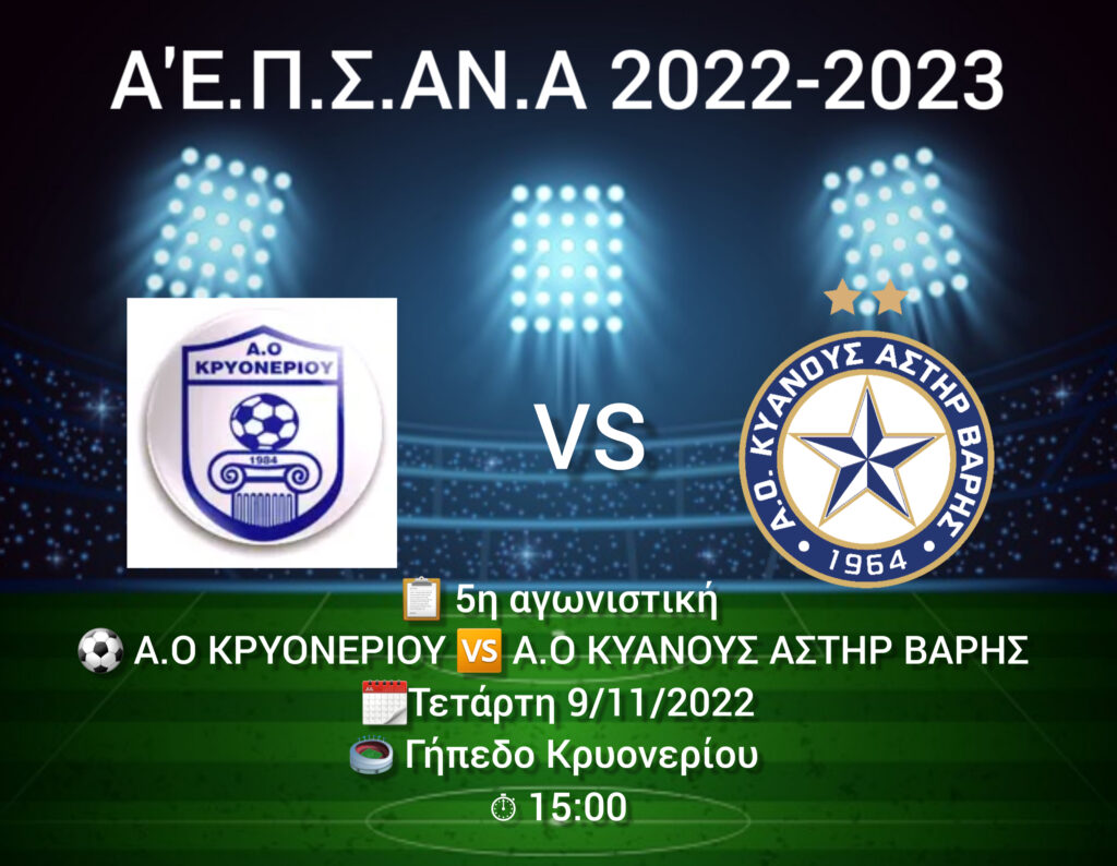 ΤΗΝ ΤΕΤΑΡΤΗ ΠΗΓΑΙΝΟΥΜΕ ΣΤΟ ΚΡΥΟΝΕΡΙ ΓΙΑ ΝΑ ΑΝΤΙΜΕΤΩΠΙΣΟΥΜΕ ΤΗΝ ΤΟΠΙΚΗ ΟΜΑΔΑ ΣΤΑ ΠΛΑΙΣΙΑ ΤΗΣ 5ης ΑΓΩΝΙΣΤΙΚΗΣ ΤΟΥ ΠΡΩΤΑΘΛΗΜΑΤΟΣ ΤΗΣ Α’ΚΑΤΗΓΟΡΙΑΣ Ε.Π.Σ.ΑΝ.Α ΜΕ ΩΡΑ ΕΝΑΡΞΗΣ 15:00