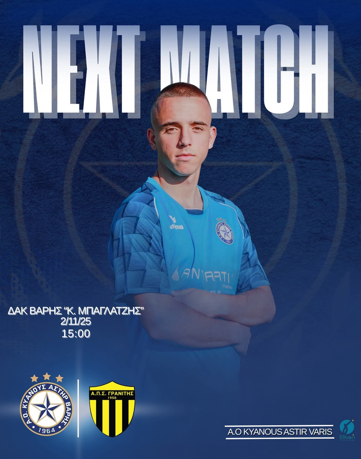 Το διοικητικό συμβούλιο του συλλόγου, το τεχνικό επιτελείο και οι ποδοσφαιριστές απευθύνουν κάλεσμα στους φιλάθλους να παρακολουθήσουν τον αγώνα της Γ’ Εθνικής για την 7η αγωνιστική του πρωταθλήματος: ΑΟ ΚΥΑΝΟΥΣ ΑΣΤΗΡ ΒΑΡΗΣ – ΓΡΑΝΙΤΗΣ ΑΓΙΑΣ ΜΑΡΙΝΑΣ στο ΔΑΚ Βάρης «Κωνσταντίνος Μπαγλατζης», την Κυριακή 2 Νοεμβρίου και ώρα 15.00 .