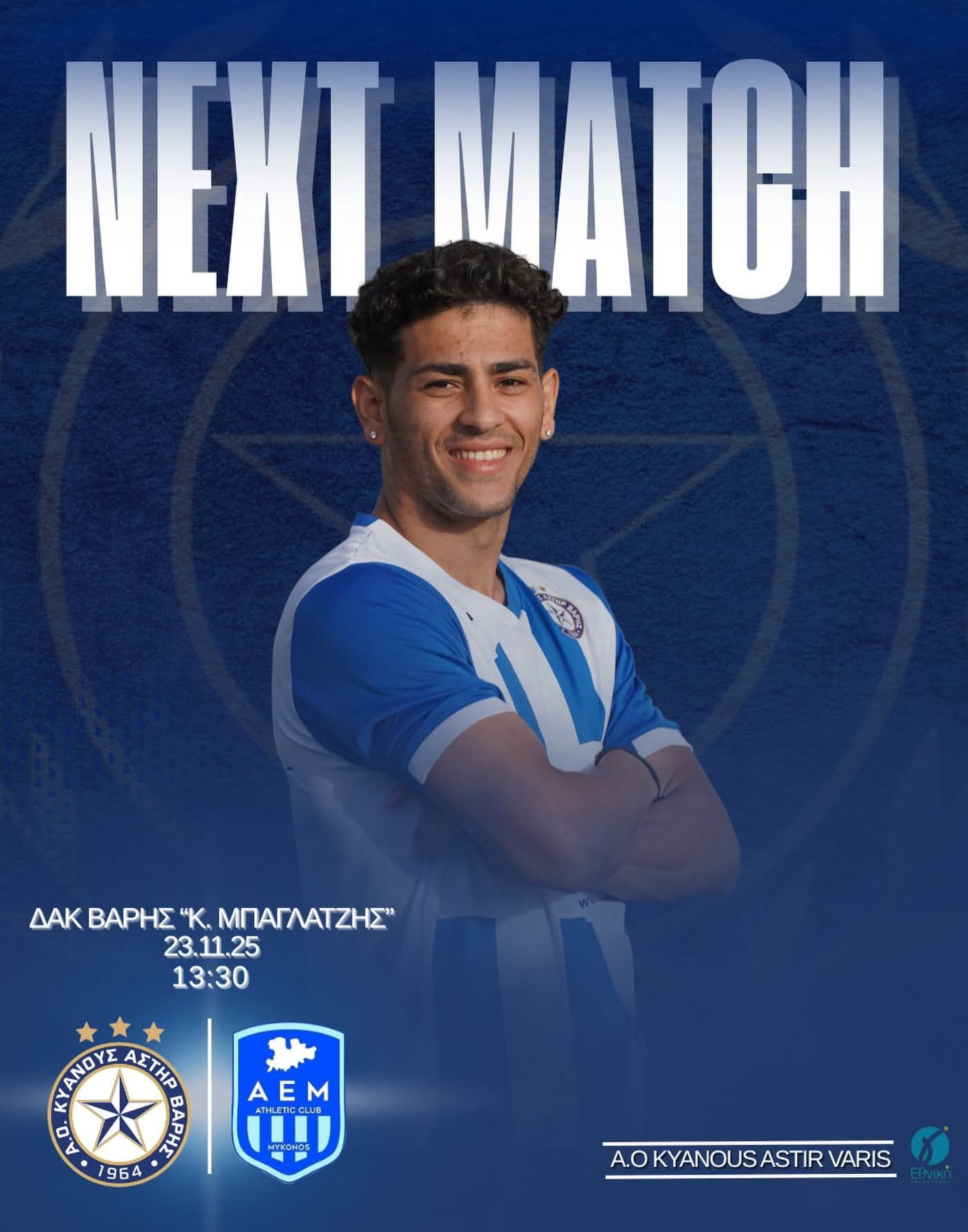 Το διοικητικό συμβούλιο του συλλόγου, το τεχνικό επιτελείο και οι ποδοσφαιριστές απευθύνουν κάλεσμα στους φιλάθλους της Ανατολικής Αττικής για να απολαύσουν ένα μεγάλο παιχνίδι -ντέρμπι μεταξύ δύο κορυφαίων ομάδων της Γ’ Εθνικής για την 10η αγωνιστική του πρωταθλήματος: ΑΟ ΚΥΑΝΟΥΣ ΑΣΤΗΡ ΒΑΡΗΣ – ΑΕ ΜΥΚΟΝΟΥ .