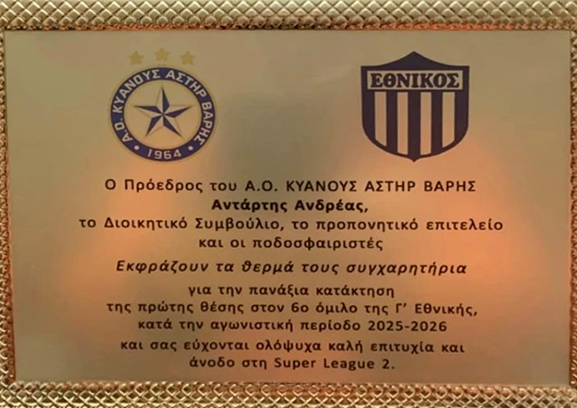 «Ο Εθνικός αισθάνεται την υποχρέωση να εκφράσει τις θερμές του ευχαριστίες προς την ομάδα του Αστέρας Βάρης και ιδιαίτερα προς τον Πρόεδρο της, κ. Ανδρέα Αντάρτη, καθώς και προς τη διοίκηση, το προπονητικό επιτελείο και τους ποδοσφαιριστές της ομάδας, για την τιμητική απονομή πλακέτας στην ομάδα μας, με αφορμή την κατάκτηση της πρώτης θέσης στον 6ο Όμιλο.