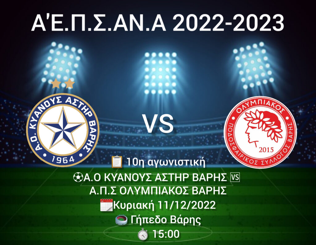 Την Κυριακή 11/12 ο ΑΣΤΕΡΑΣ μας θα αντιμετωπίσει εντός έδρας τον Ολυμπιακό Βάρης για την 10η αγωνιστική του πρωταθλήματος Α’Ε.Π.Σ.ΑΝ.Α
