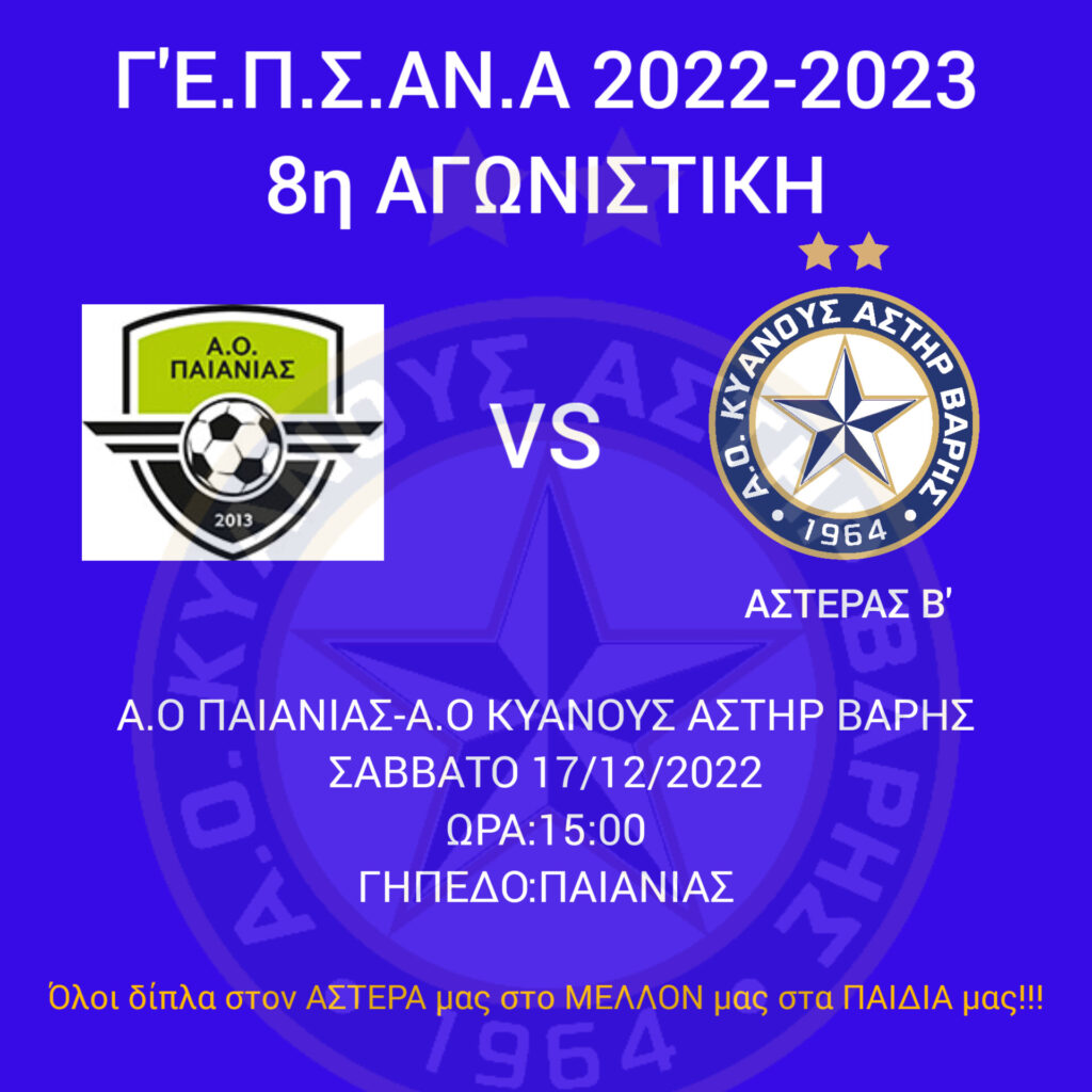 Το Σάββατο 17/12 ο ΑΣΤΕΡΑΣ Β’ Θα αντιμετωπίσει εκτός έδρας τον Α.Ο ΠΑΙΑΝΙΑΣ για την 8η Αγωνιστική του Πρωταθλήματος Γ’Ε.Π.Σ.ΑΝ.Α.