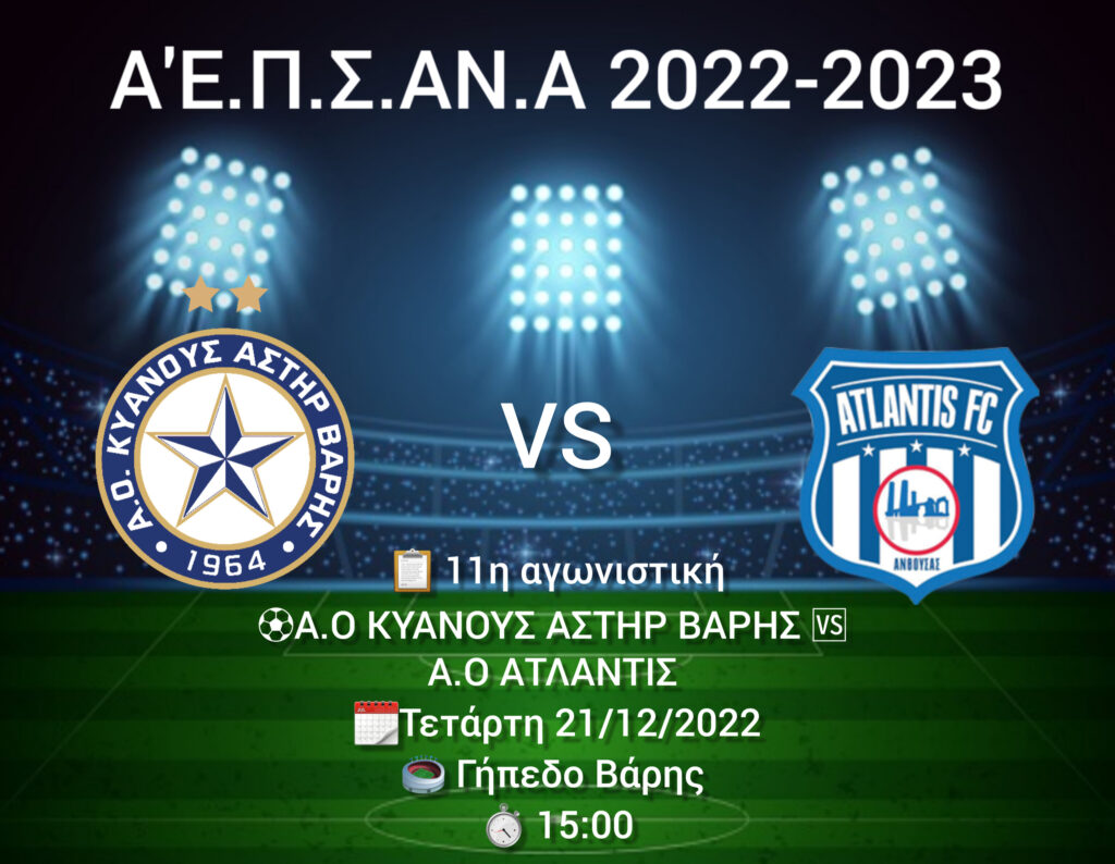 Την Τετάρτη 21/12 ο ΑΣΤΕΡΑΣ μας θα αντιμετωπίσει τον Α.Ο Ατλαντίς εντός έδρας γαι την 12 αγωνιστική του πρωταθλήματος Α’Ε.Π.Σ.ΑΝ.Α.