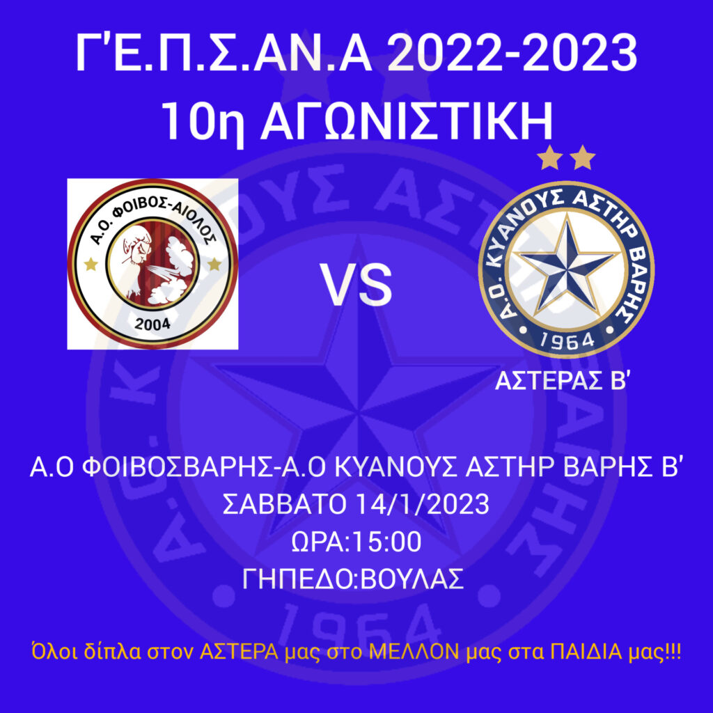 Το Σάββατο 14/1 αντιμετωπίζουμε εκτός έδρας τον Α.Ο Φοίβο Βάρης για την 10η Αγωνιστική του Πρωταθλήματος Γ’Ε.Π.Σ.ΑΝ.Α.