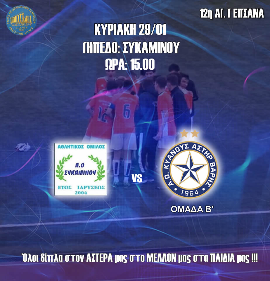 Την Κυριακή 29/1 αντιμετωπίζουμε εκτός έδρας τον Α.Ο ΣΥΚΑΜΙΝΟΥ για την 12η Αγωνιστική του Πρωταθλήματος Γ’Ε.Π.Σ.ΑΝ.Α.